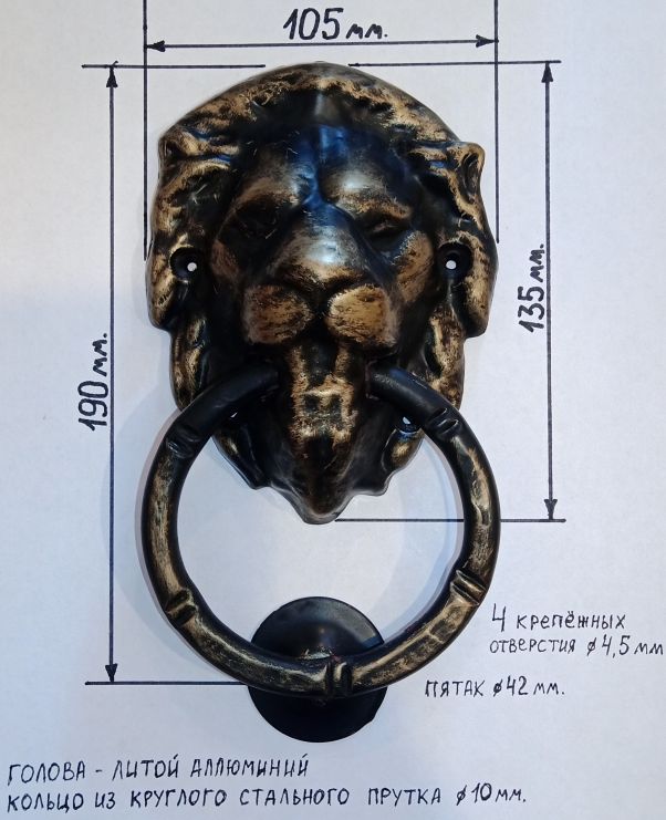 ОписаниеРучка кольцо "Лев" №1 (кнокер) выполнена виде головы льва. Ручка-кольцо, дверная ручка гонг, дверной молоток или стучалка предназначена для входной двери и обычно устанавливается по центру полотна на высоте около полутора метров. На тыльной стороне кольца в ней есть подобие молоточка, которым можно постучать в дверь.
