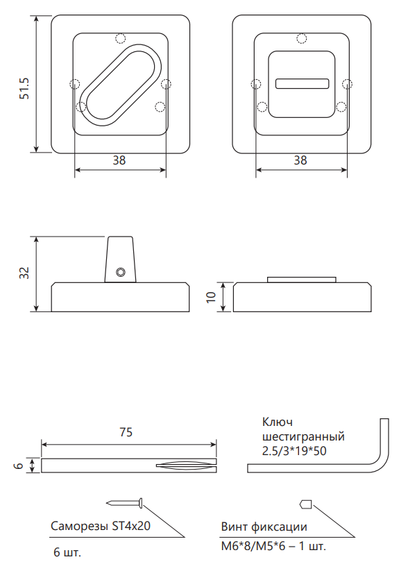 - Размер сечения квадрата фиксатора - 6 мм;