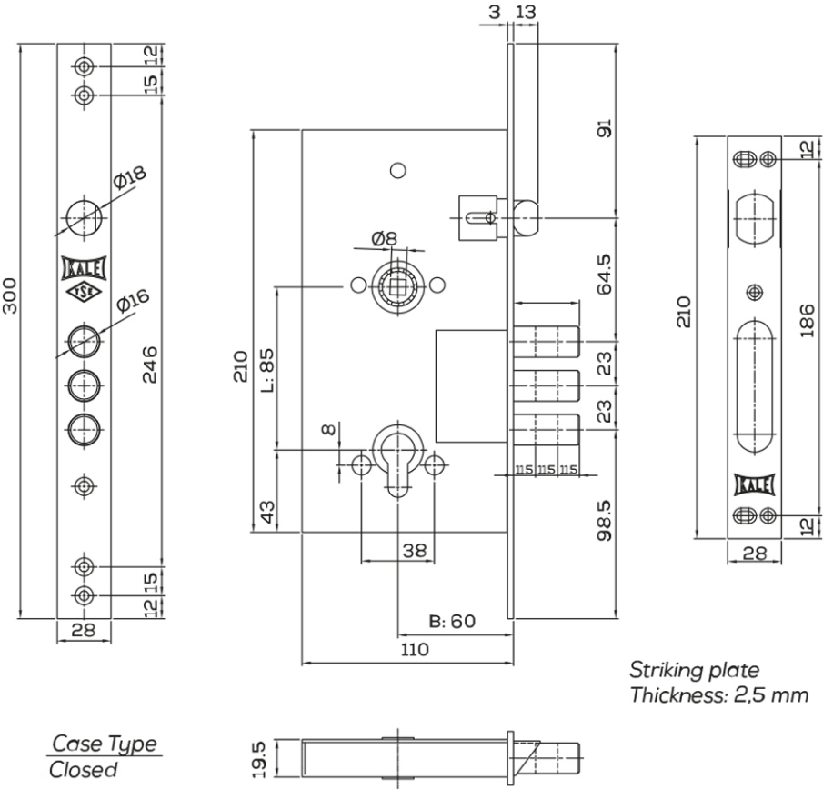 Замок врезной цилиндровый KALE KILIT 252R,85BS60,28CP,w/o SP,w/o Ros,PB