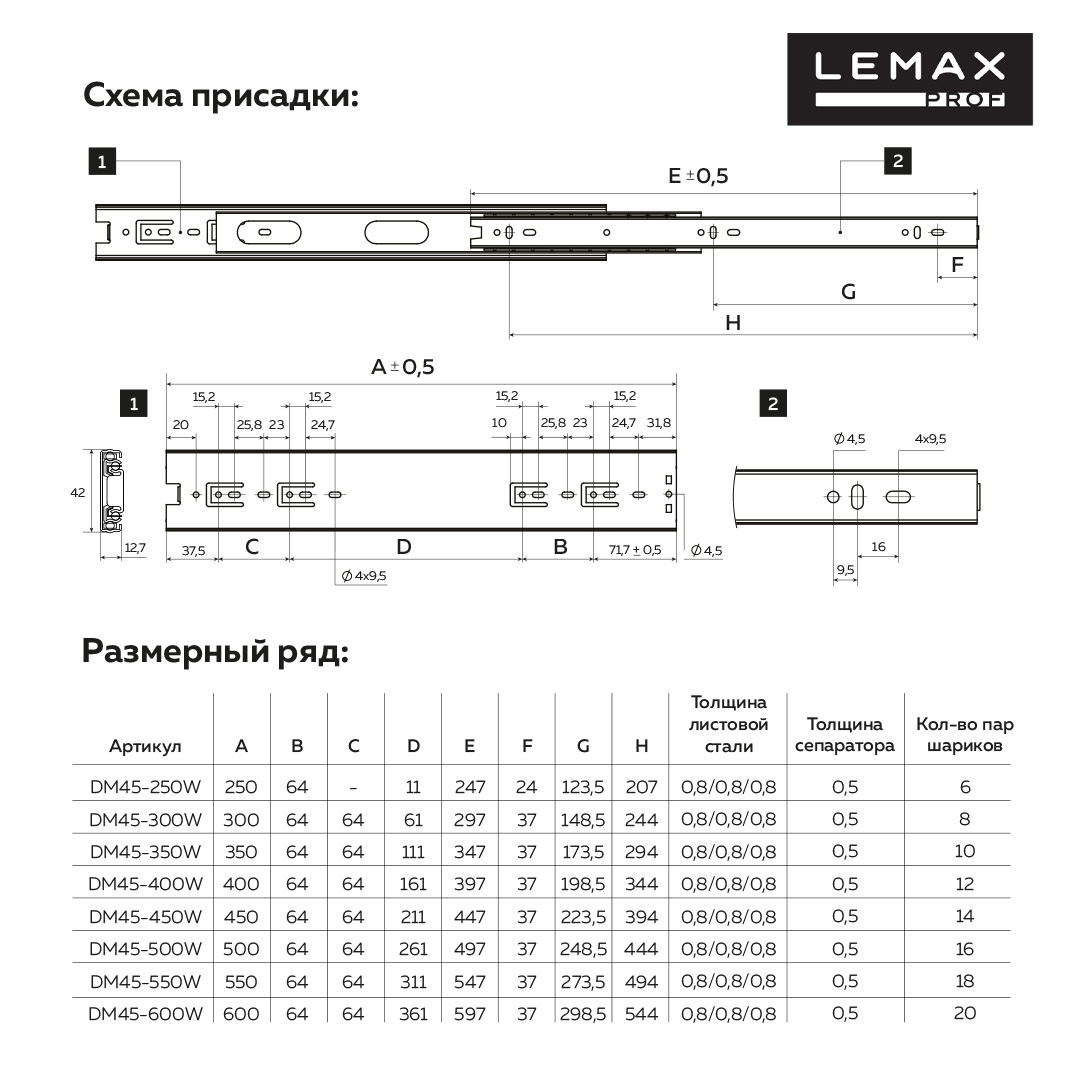 Направляющие шариковые полного выдвижения 500мм, DM45-500W (сталь)